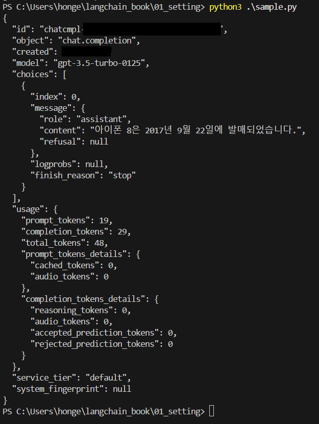 여기까지 Chat 모델의 기본적인 API 호출 방법과 응답 읽는 방법에 대해 알아봤다.