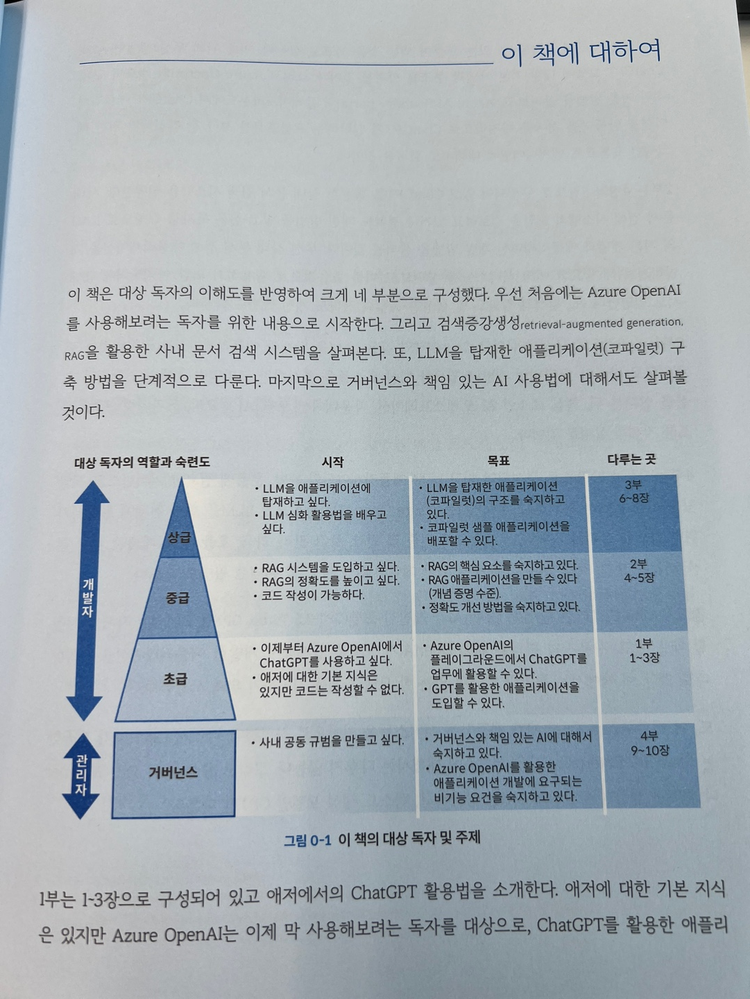 - 4~8장 (응용): Azure OpenAI API를 활용한 실전 구현, RAG(Retrieval-Augmented Generation) 아키텍처 구성, 임베딩 처리, 벡터 검색 등 실무 중심 내용