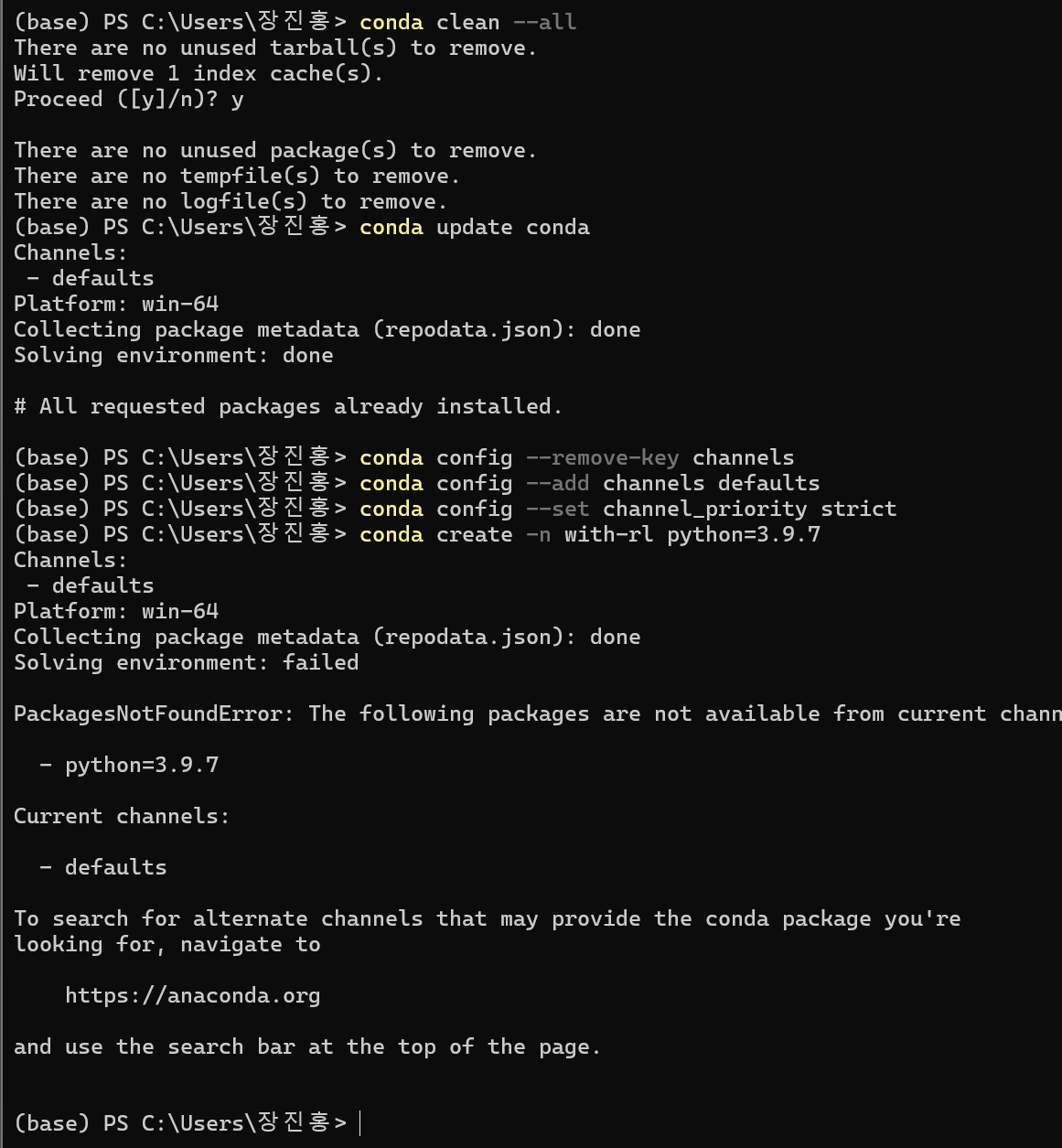 conda가 해당 버전의 python 패키지를 default 채널에서 못 찾고 있는 게 아닐까 싶었다.