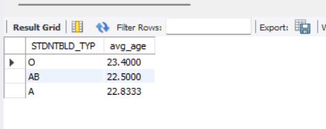 SELECT s.STDNTBLD_TYP, AVG(YEAR(curdate()) - YEAR(s.stdntbth_day)) as avg_age