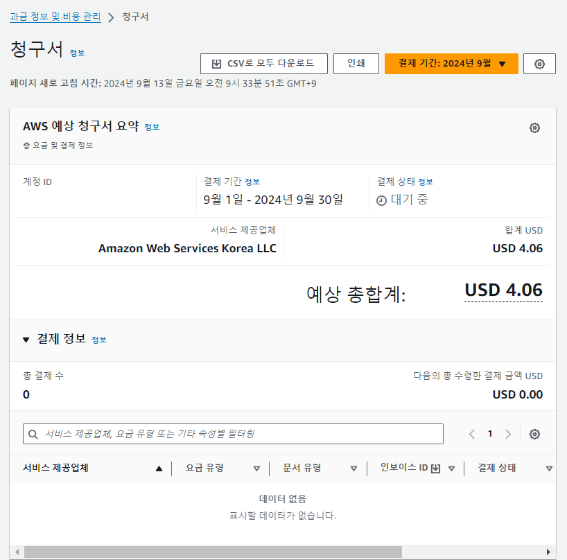 Amazon Web Services Korea LLC 서비스별 요금을 확인하면 된다.