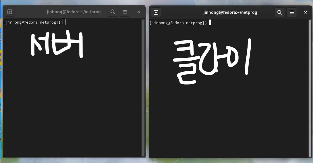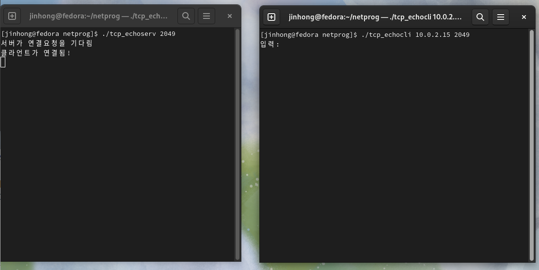 ํด๋ผ์ด์ธํธ ํ์ผ์ ์คํํ๋ ์๋ฒ ์ธก์์๋ถํฐ ํด๋ผ์ด์ธํธ์์ ์ฐ๊ฒฐ์ด ์ฑ๊ณต๋์์์ ํ์ธํ๋ค.