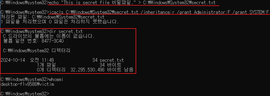 ์ด ์๋๋ฆฌ์ค์์๋ ๊ถํ ์์น์ ํตํด ๋ฃจํธ ๊ถํ์ ํ๋ํด์ผ๋ง secret.txt ํ์ผ์ ๋ณผ ์ ์๋ค.