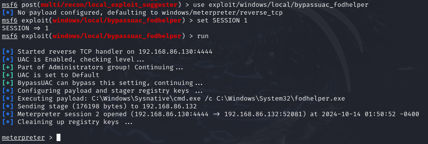 exploit/windows/local/bypassuac_fodhelper๋ ๋์์ด UAC ์ฐํ์ ์ทจ์ฝํ ๊ฒ์ผ๋ก ๋ํ๋จ์ ์๋ฏธํ๋ค. ์ด๋ฅผ ํตํด UAC ํ๋กฌํํธ๋ฅผ ํธ๋ฆฌ๊ฑฐํ์ง ์๊ณ ๋ ์์น๋ ๊ถํ์ผ๋ก ๋ช ๋ น์ ์คํํ ์ ์๊ฒ ๋๋ค.