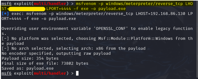 3.set LHOST 192.168.86.130 # (your attacking machine's IP) ๋ฐฑ๋์ด๊ฐ ๋ค์ ์ฐ๊ฒฐํ LHOST ๋ฐ LPORT(IP ์ฃผ์ ๋ฐ ํฌํธ)๋ฅผ ์ง์ ํด์ผ ํฉ๋๋ค. ์ด๋ ๋ฐฑ๋์ด๋ฅผ ์์ฑํ ๋ ์ฌ์ฉํ ์ค์ ๊ณผ ์ผ์นํด์ผ ํจ!!